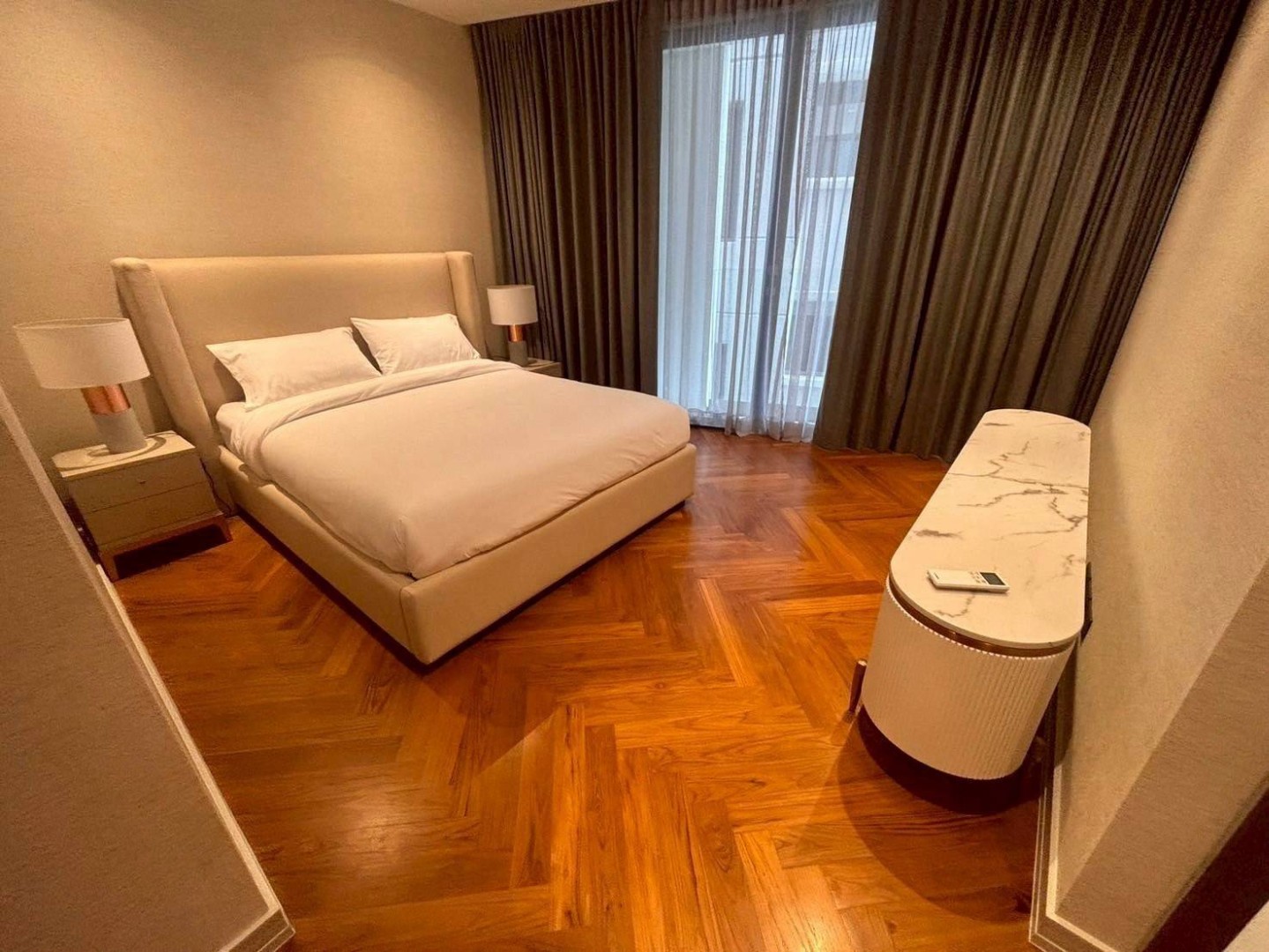 Spanning 85.63 sq.m., the apartment features a spacious open-plan living and dining area, a sleek contemporary kitchen, and 3 comfortable bedrooms, including a master suite with en-suite bathroom. Carefully selected furnishings and tasteful décor create a warm yet modern atmosphere, perfect for both relaxation and entertaining.