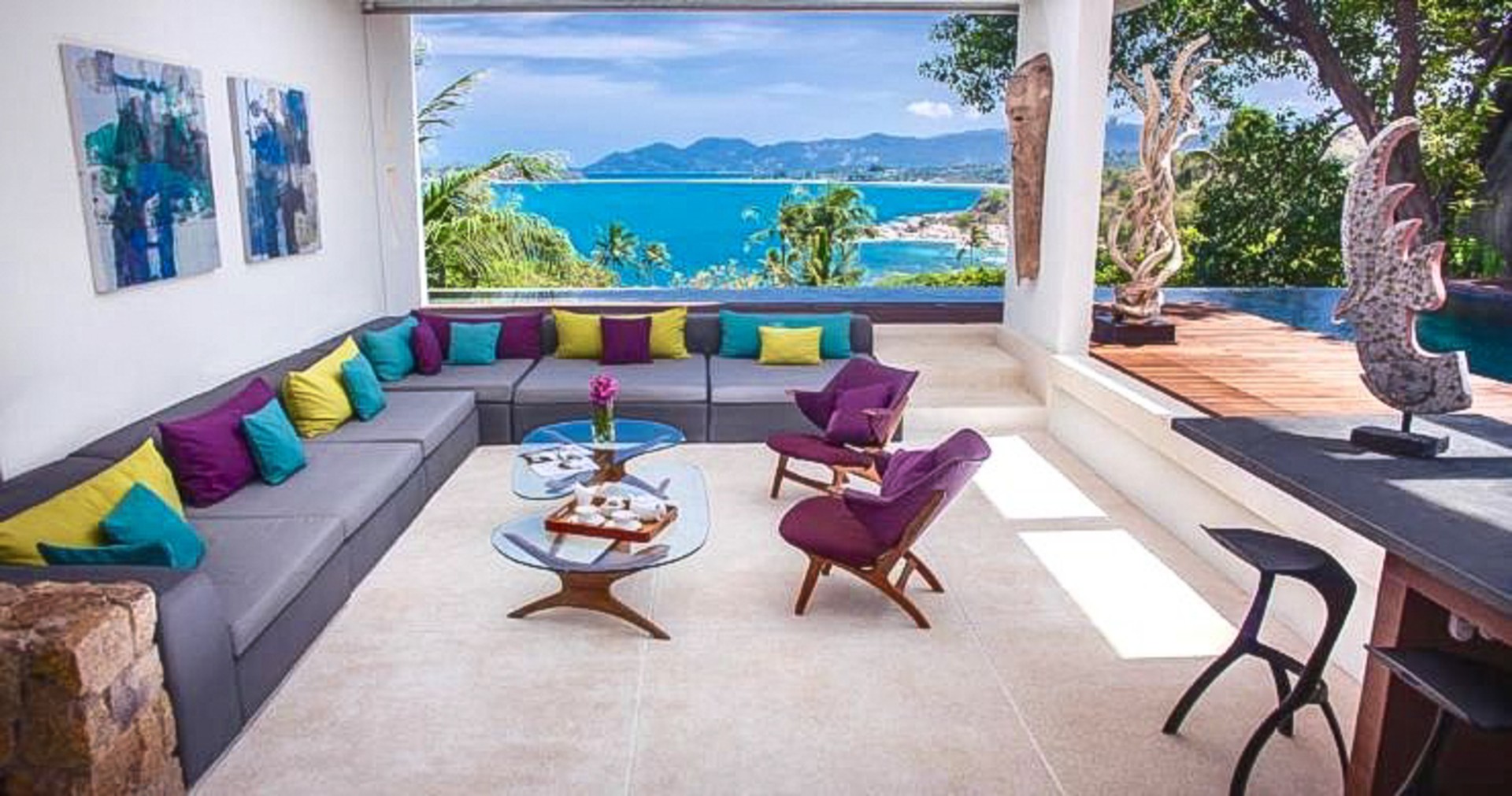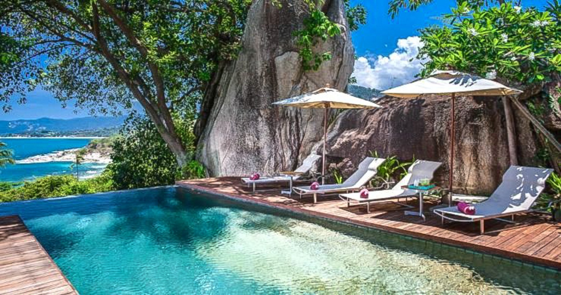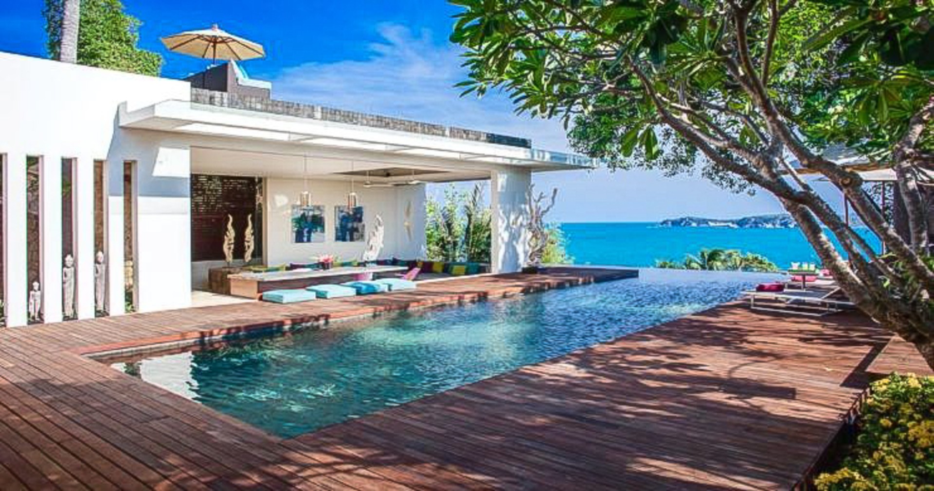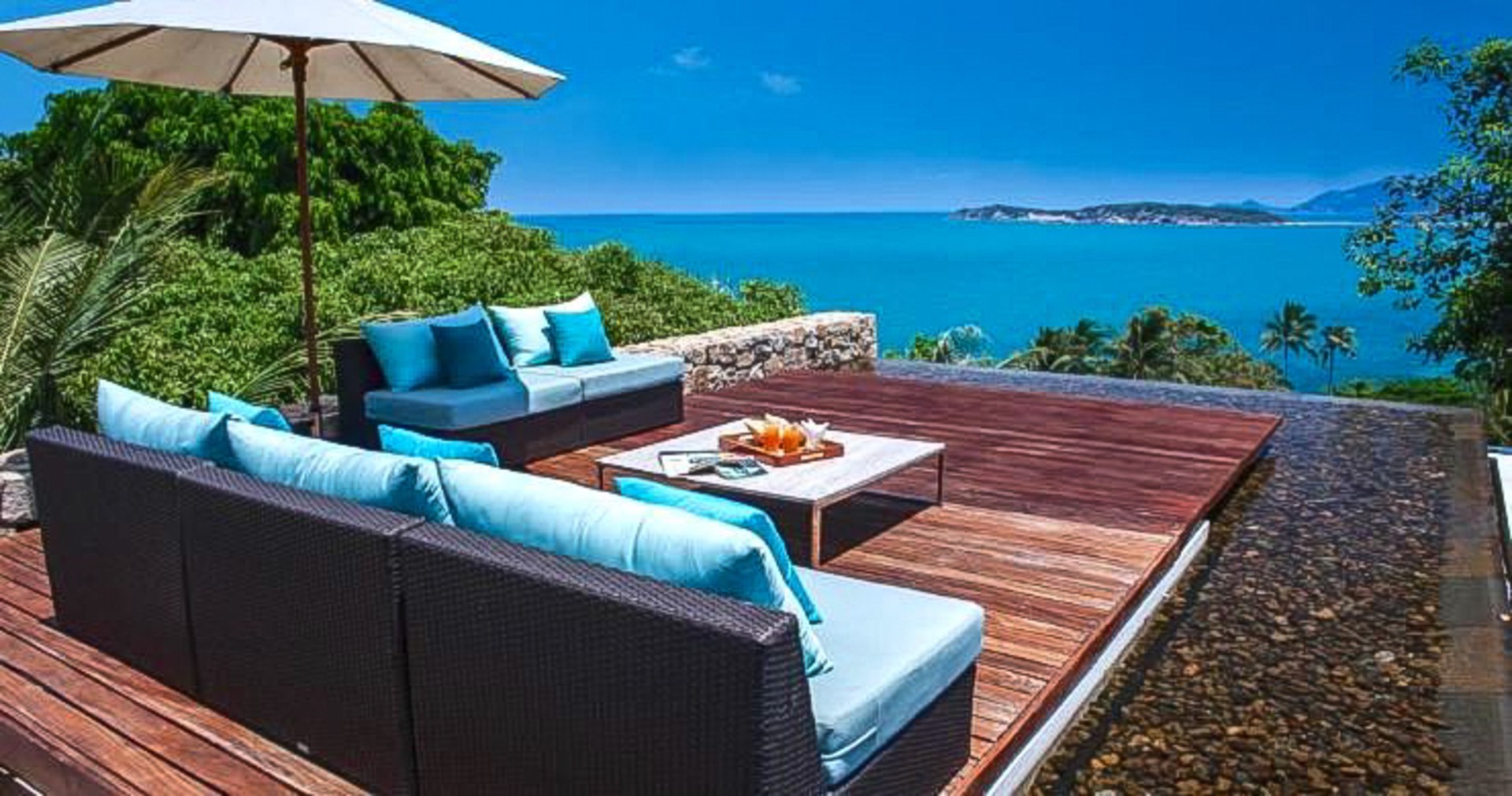 The focal point of the property is a stunning infinity-edge swimming pool and an immaculately manicured tropical garden. The huge pool forms an L-shape, wrapping around the sun-deck and open-air living spaces, with spectacular sea-views towards Koh Phangan and beyond. The pool is surrounded by well-placed shrubs, flowers, and mature trees to create a peaceful and private place, and the terrace is an ideal place for parties, BBQ’s or relaxing in the shade on a hot summer’s day.