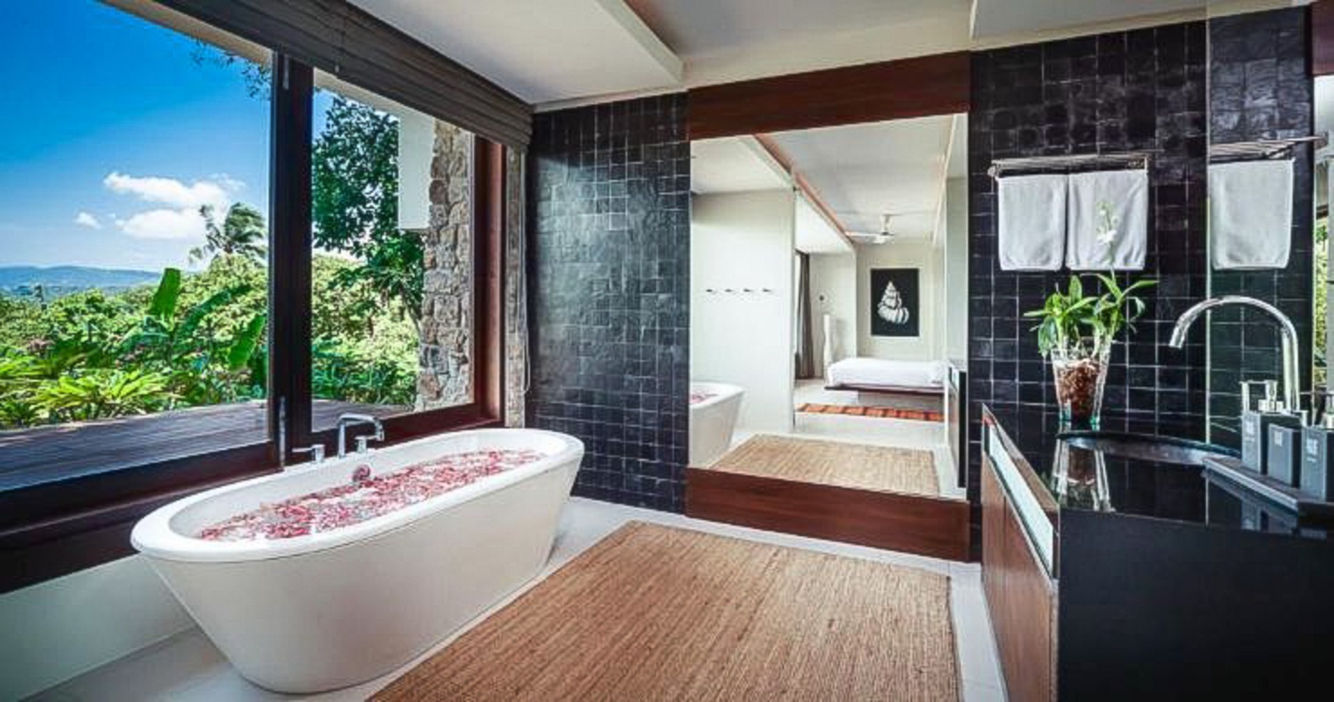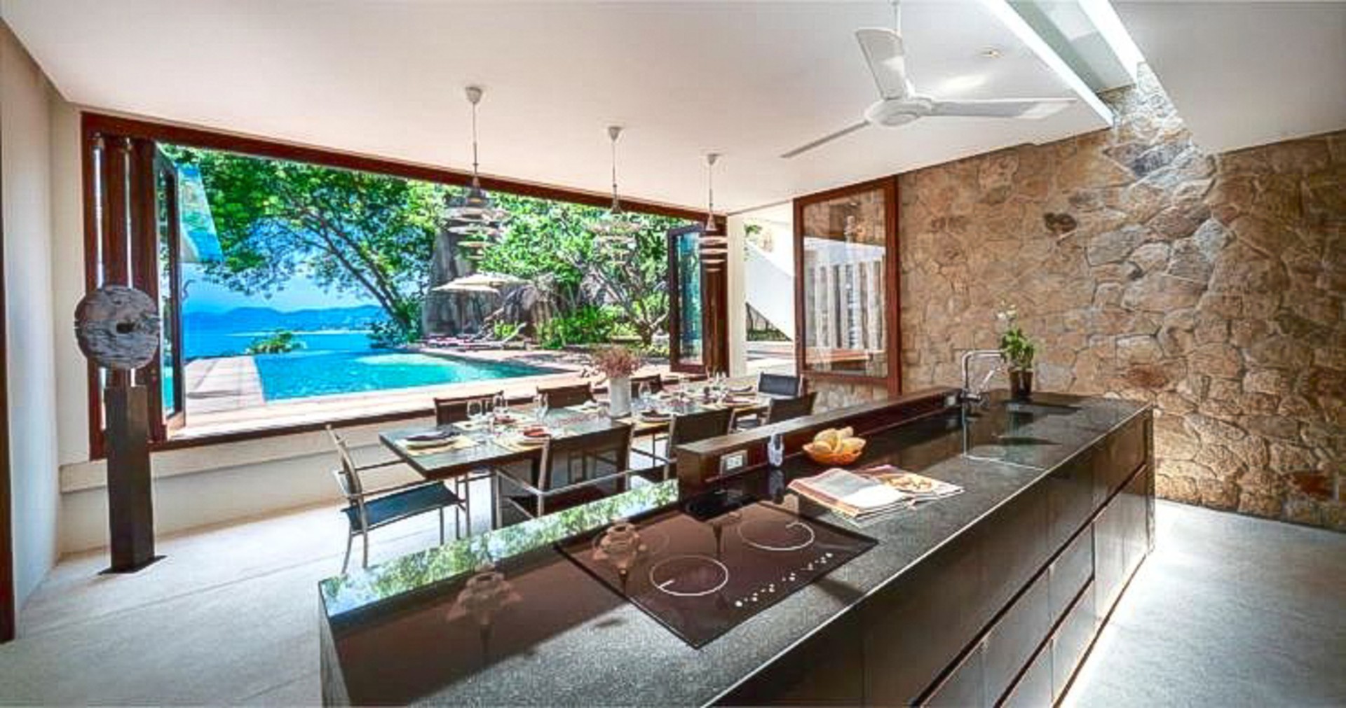 The property boasts five beautiful bedroom suites, complete with giant comfortable beds, high-quality custom-built furniture and elegant en-suite bathrooms with terrazzo oversized soaking tubs. There are stunning sea views, and lush garden views from all suites.
