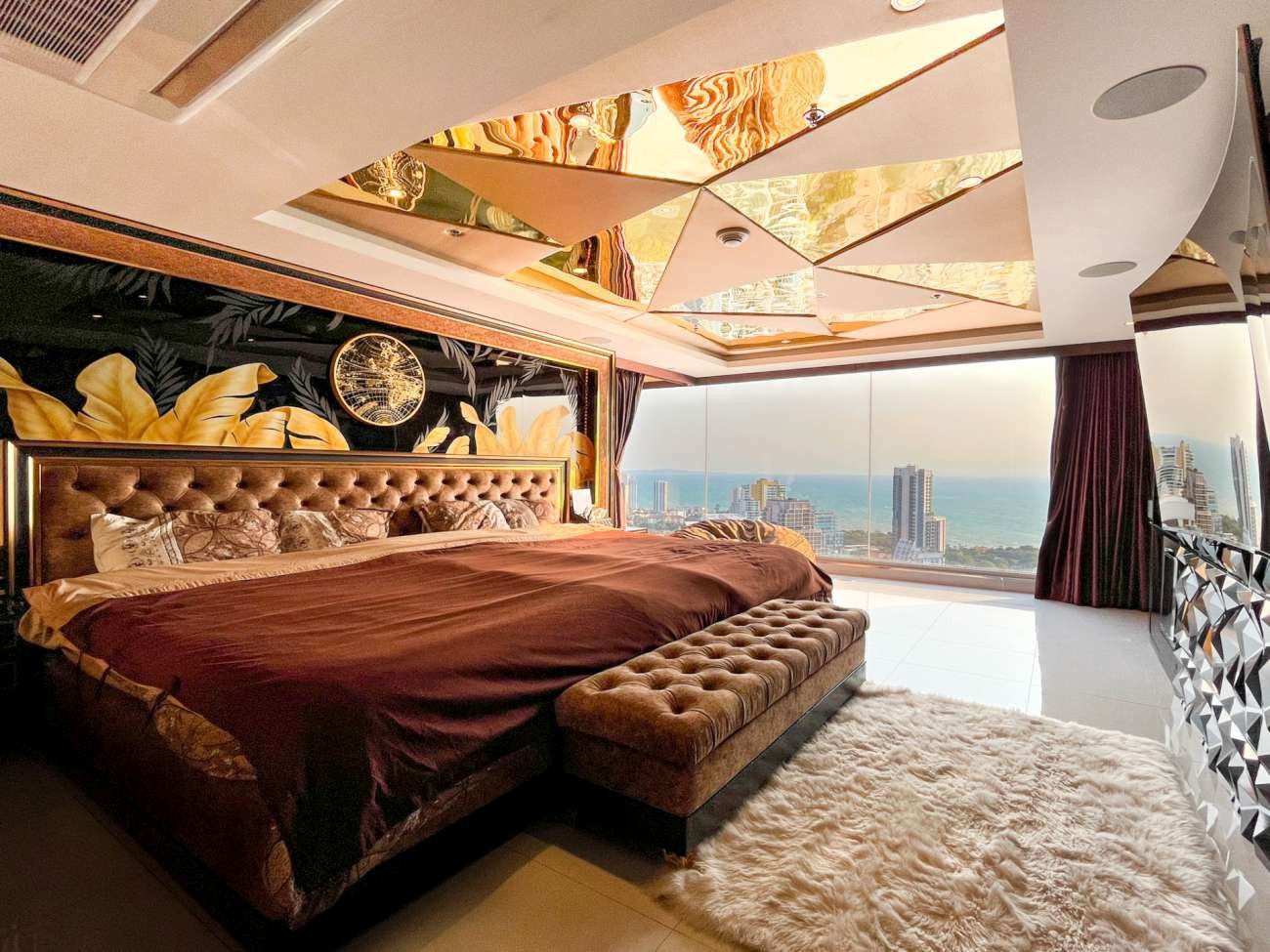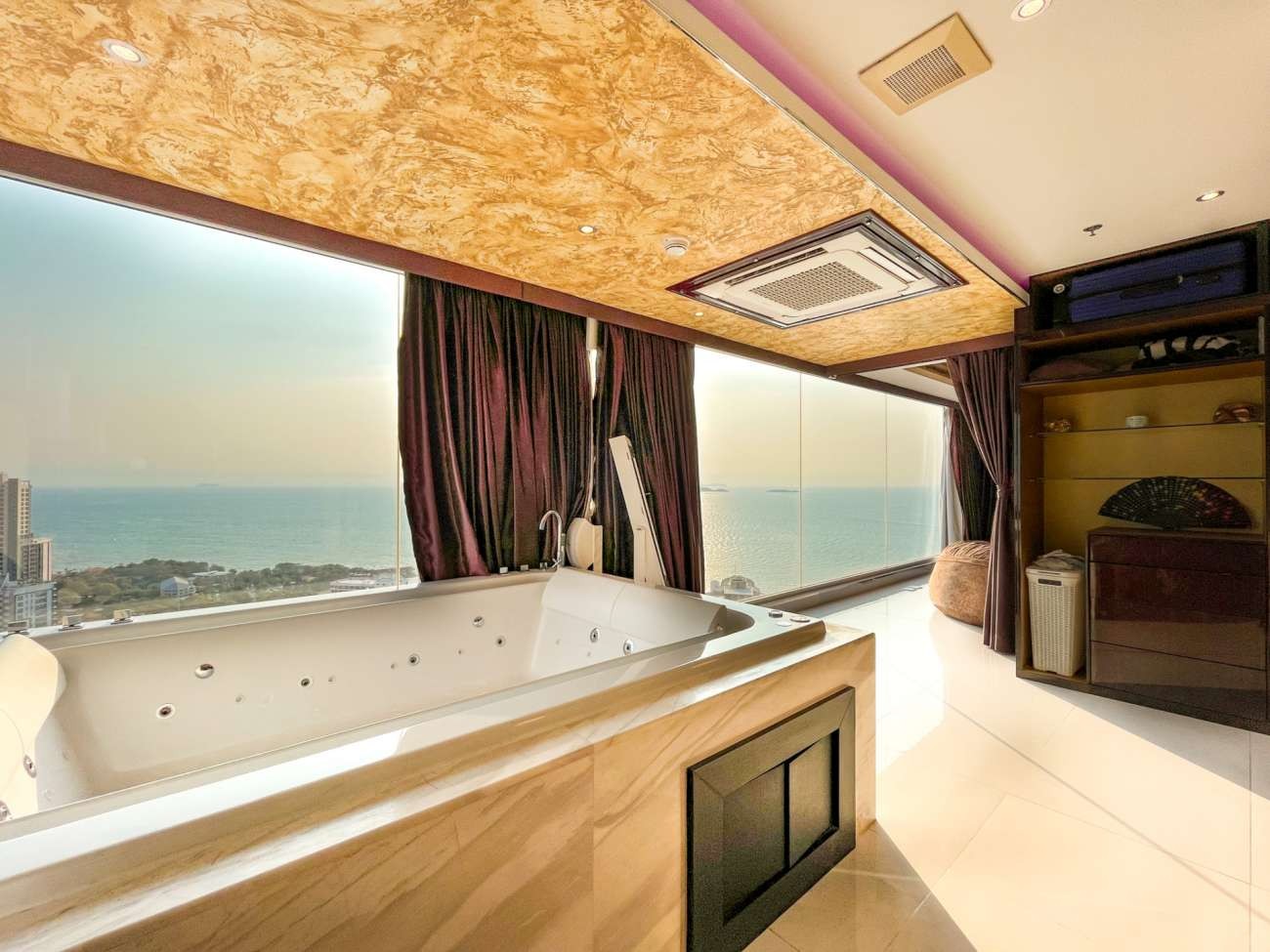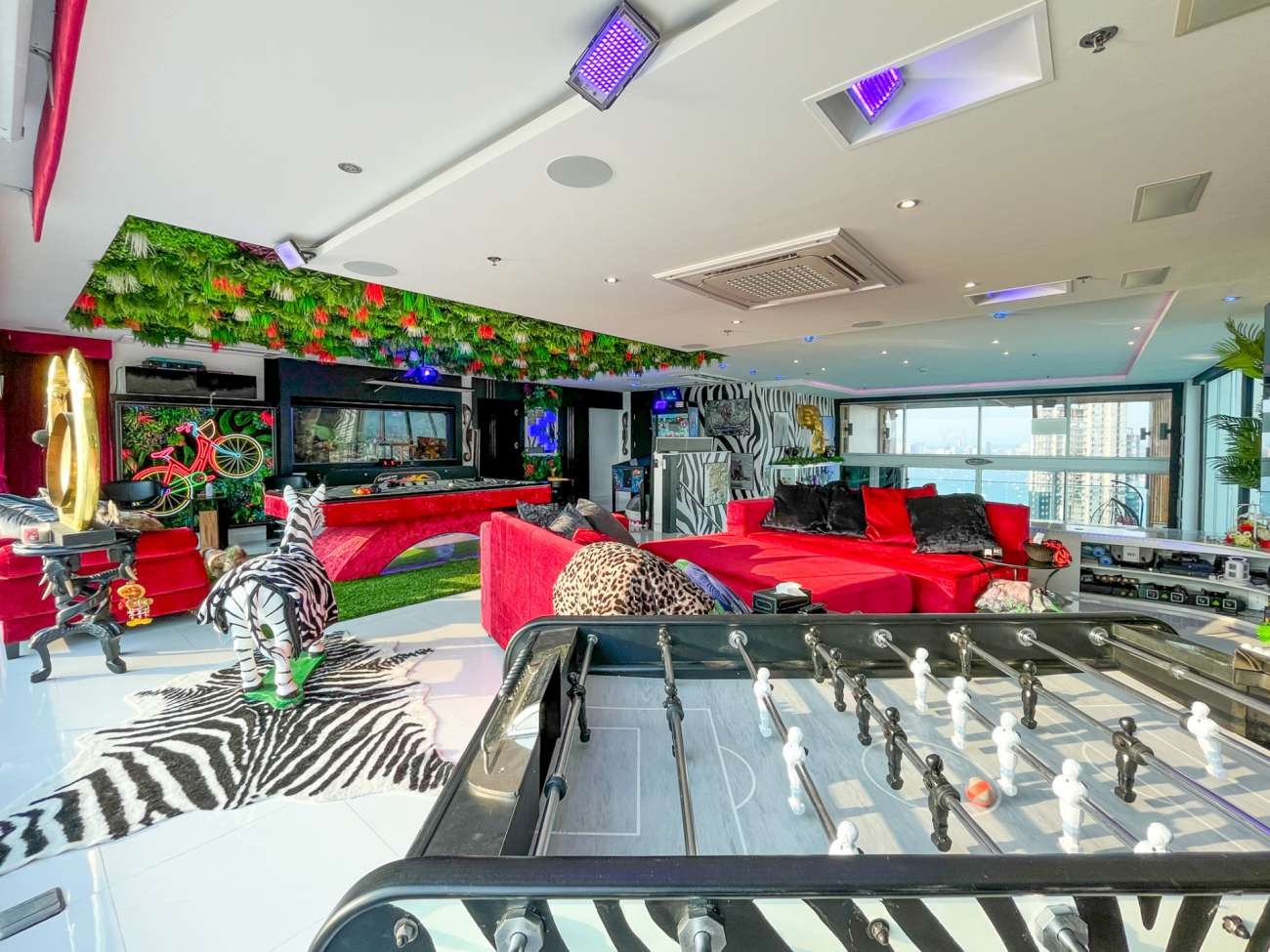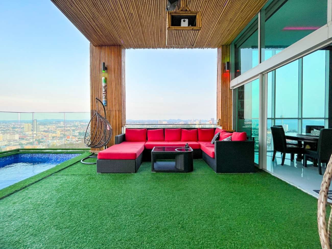 Situated on the top of Sky Residences  (formerly known as Amari Residences Pattaya) the Penthouse is in the Pratumnak Hill area of Pattaya overlooking Pattaya Bay. The 35-floor development is located  within walking distance of The Peach Exhibition Center and some of the area’s best hotels including The Royal Cliff and The Sheraton. Building amenities include a 25 meter communal swimming pool with sunbathing area and gardens, a huge five star lobby, a VIP/Business lounge area, library room, a fitness center with steam room and sauna, 4 high speed elevators, and 24 hour security.