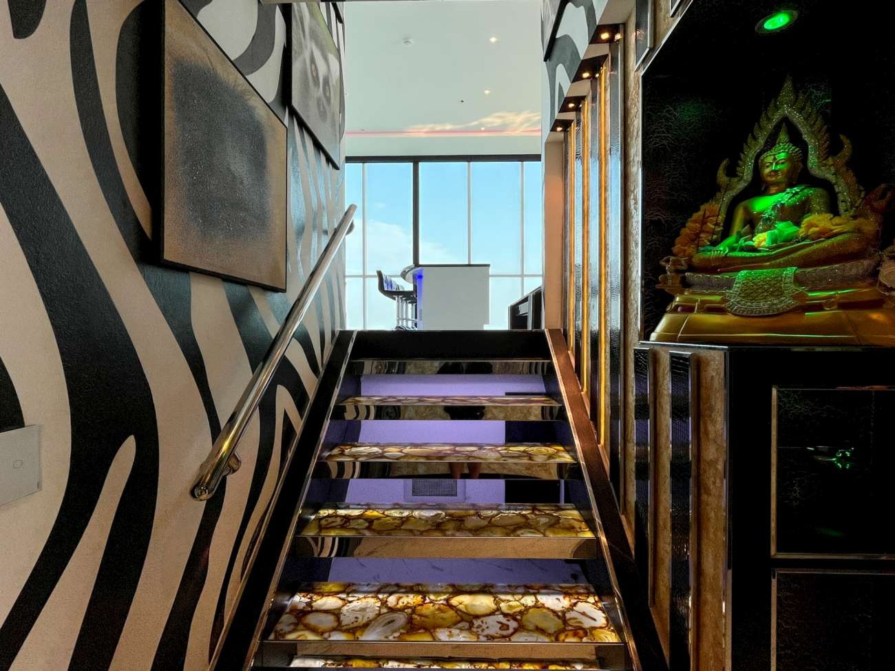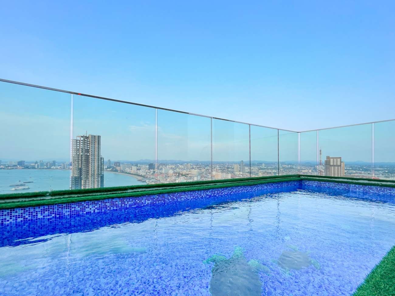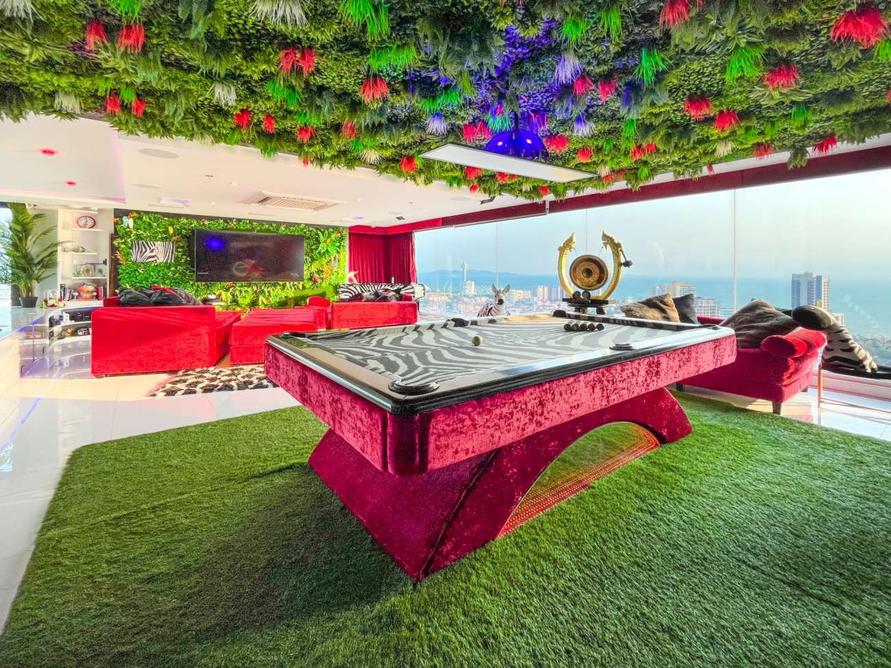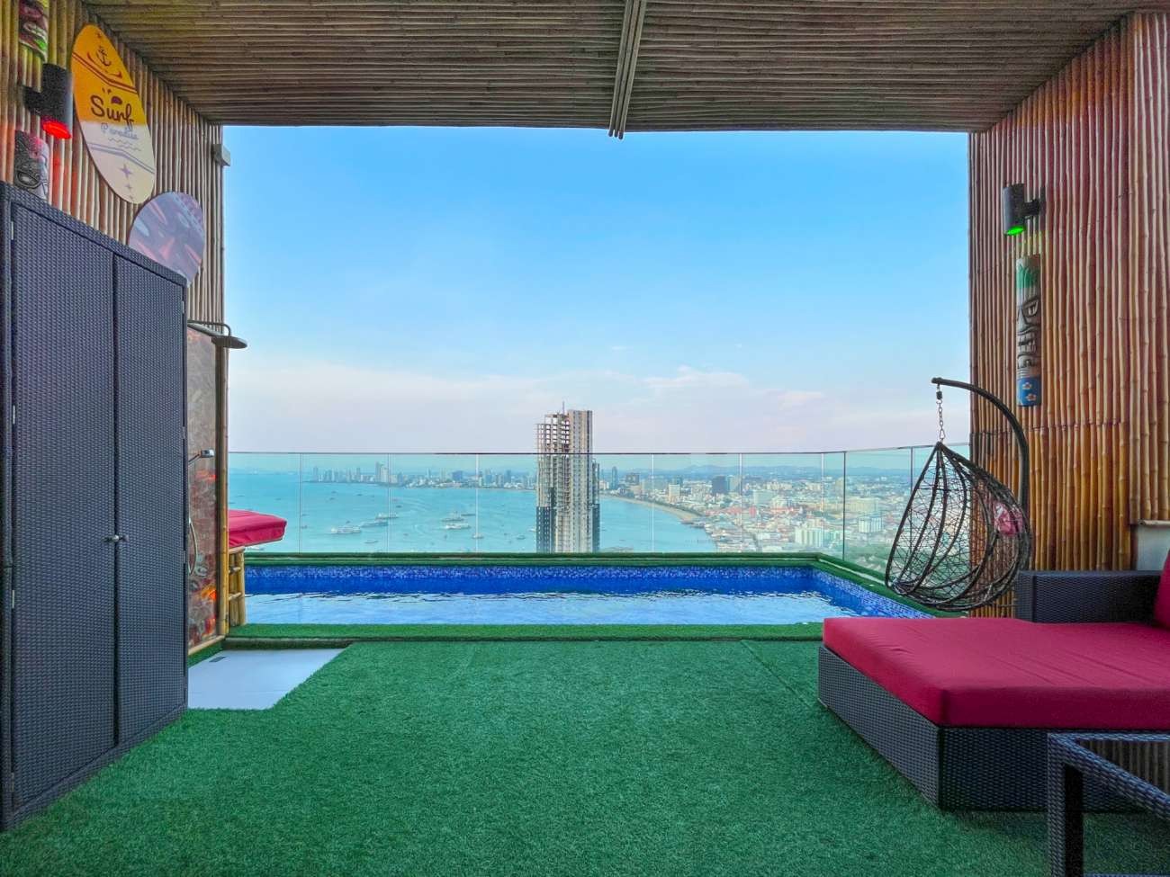 Situated on the top of Sky Residences  (formerly known as Amari Residences Pattaya) the Penthouse is in the Pratumnak Hill area of Pattaya overlooking Pattaya Bay. The 35-floor development is located  within walking distance of The Peach Exhibition Center and some of the area’s best hotels including The Royal Cliff and The Sheraton. Building amenities include a 25 meter communal swimming pool with sunbathing area and gardens, a huge five star lobby, a VIP/Business lounge area, library room, a fitness center with steam room and sauna, 4 high speed elevators, and 24 hour security.
