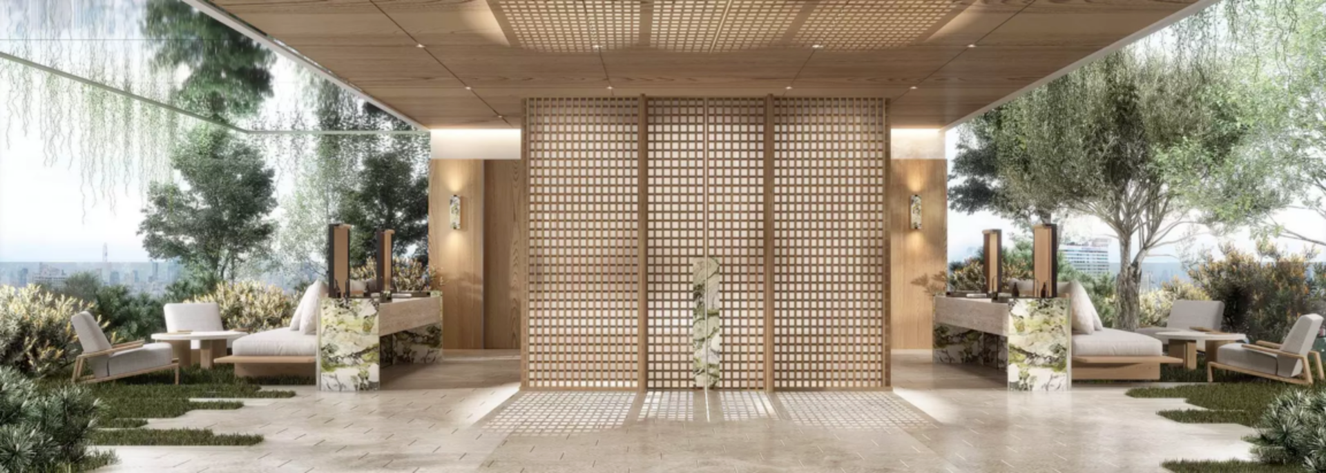 On the 30th floor are a city-view swimming pool, a children’s pool, a jacuzzi and a professional gym. On the 31st floor a wellness studio, a meditation pod, an onsen, and a treatment room. On the 32nd floor is a sky lounge and a sensory playground.