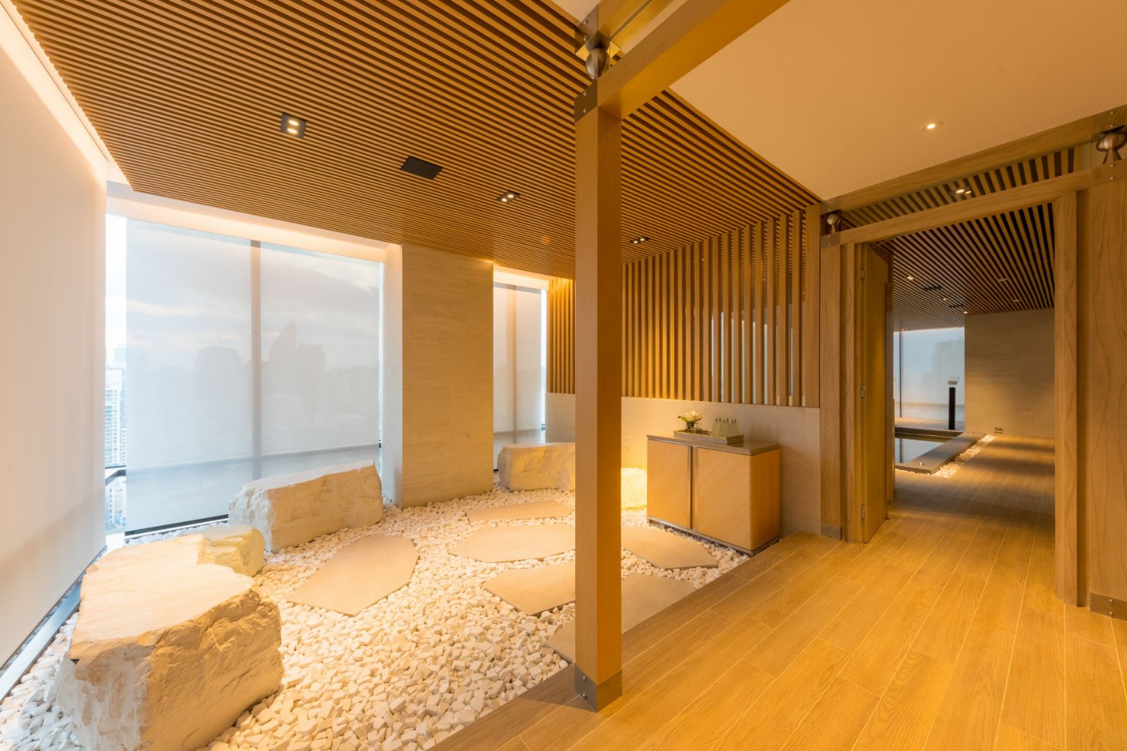 Facilities at The Bangkok Thonglor are extensive and include a green quarter, a residents’ lobby lounge and board room on the ground floor, and triple-floor facilities on the upper floors. On the roof top is a striking 360-degree swimming pool with magnificent infinity-edged views. On the 29th floor is a separate male and female onsen with changing rooms and on the 28th floor are a professional gymnasium, a residents’ reading lounge and a sky garden. There is 24-hour security and CCTV throughout the development.