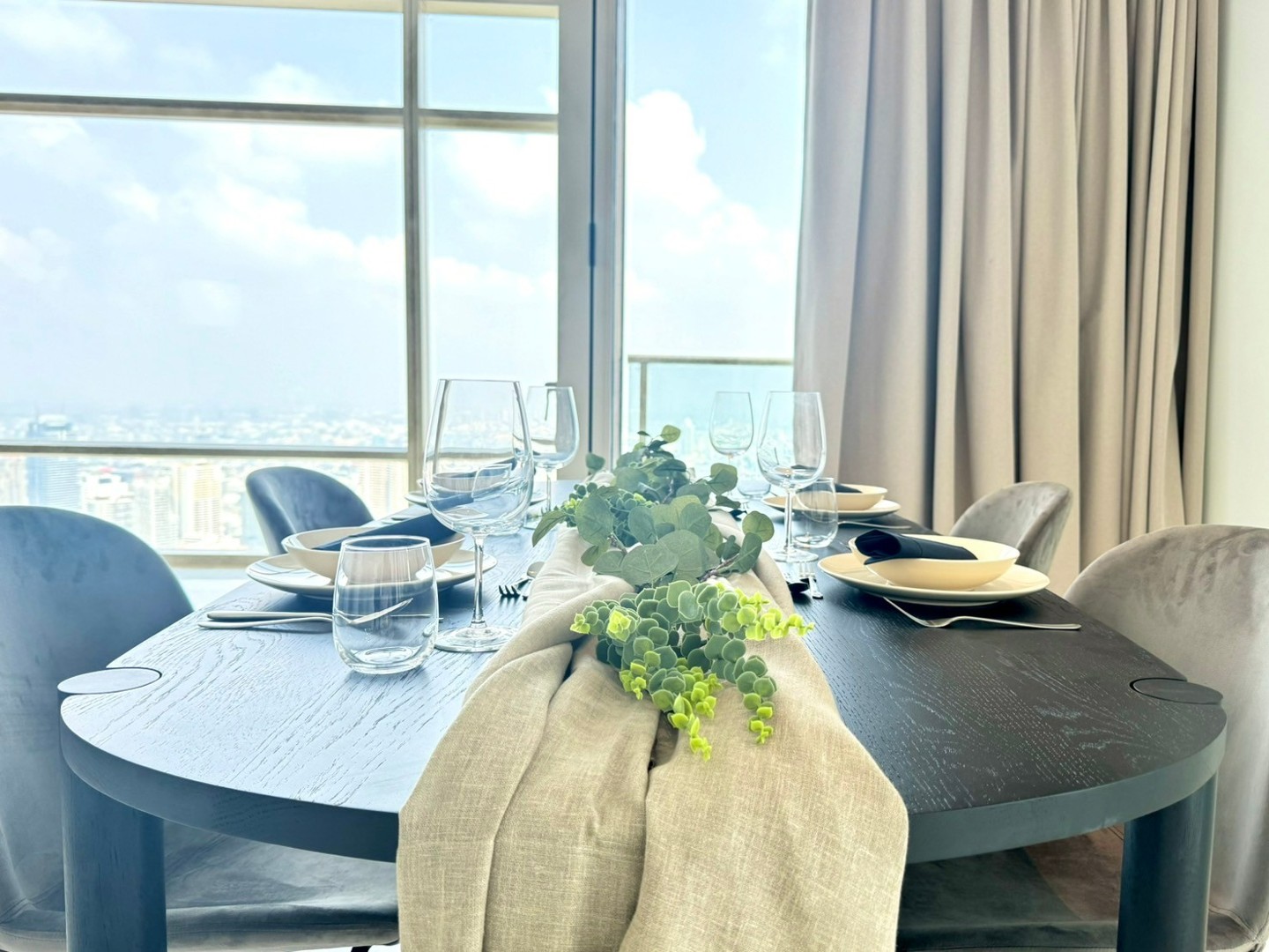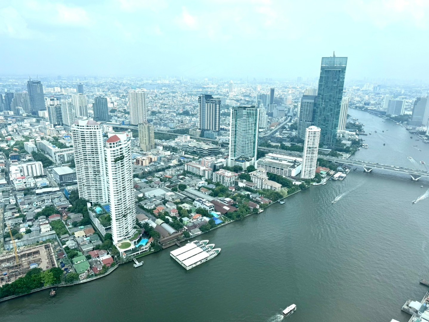 Positioned on the 52nd floor the residence extends for 194 square metres and enjoys breath taking views of the Chaopraya River and the Bangkok skyline in all directions.