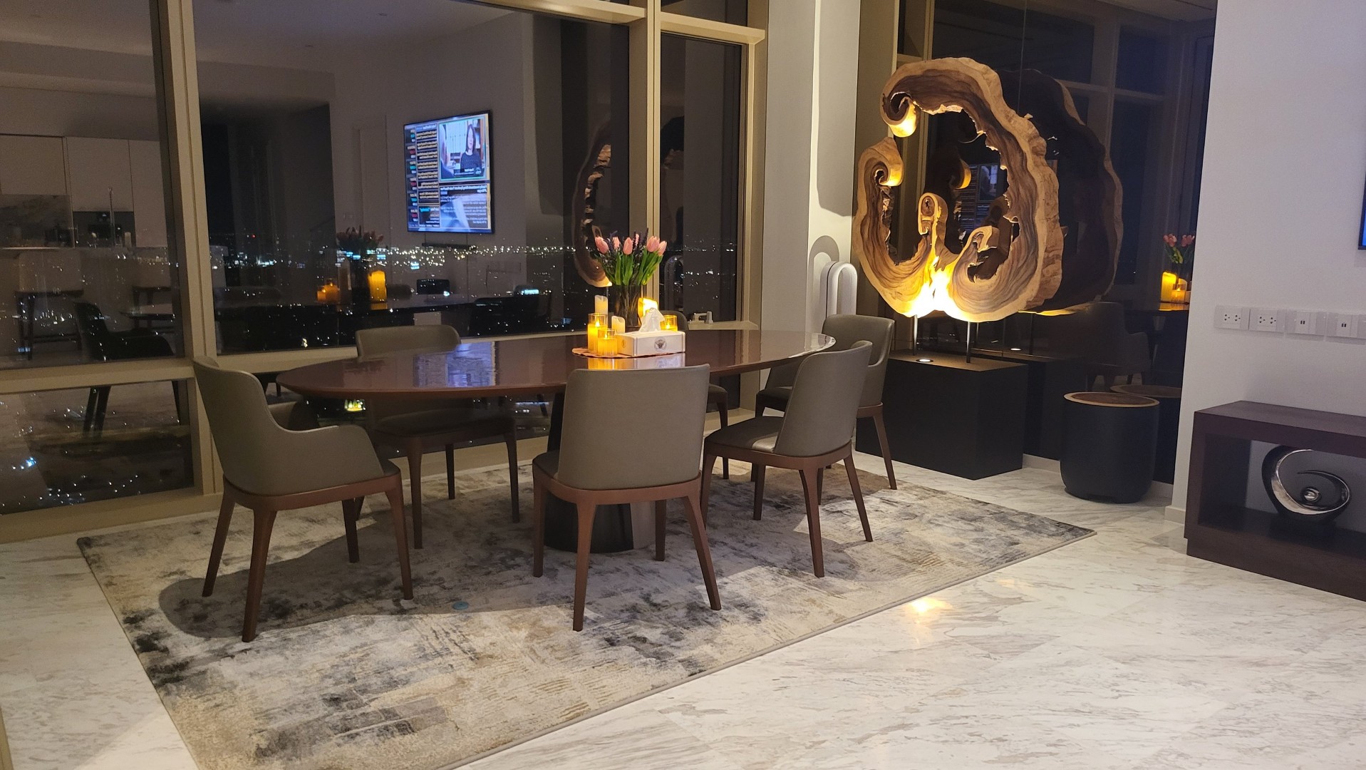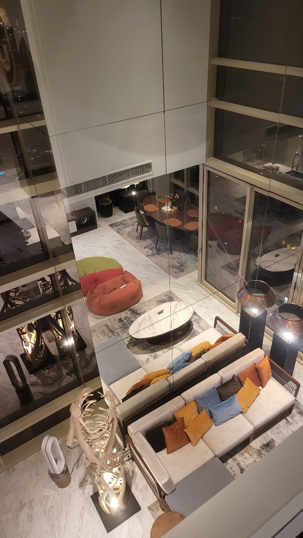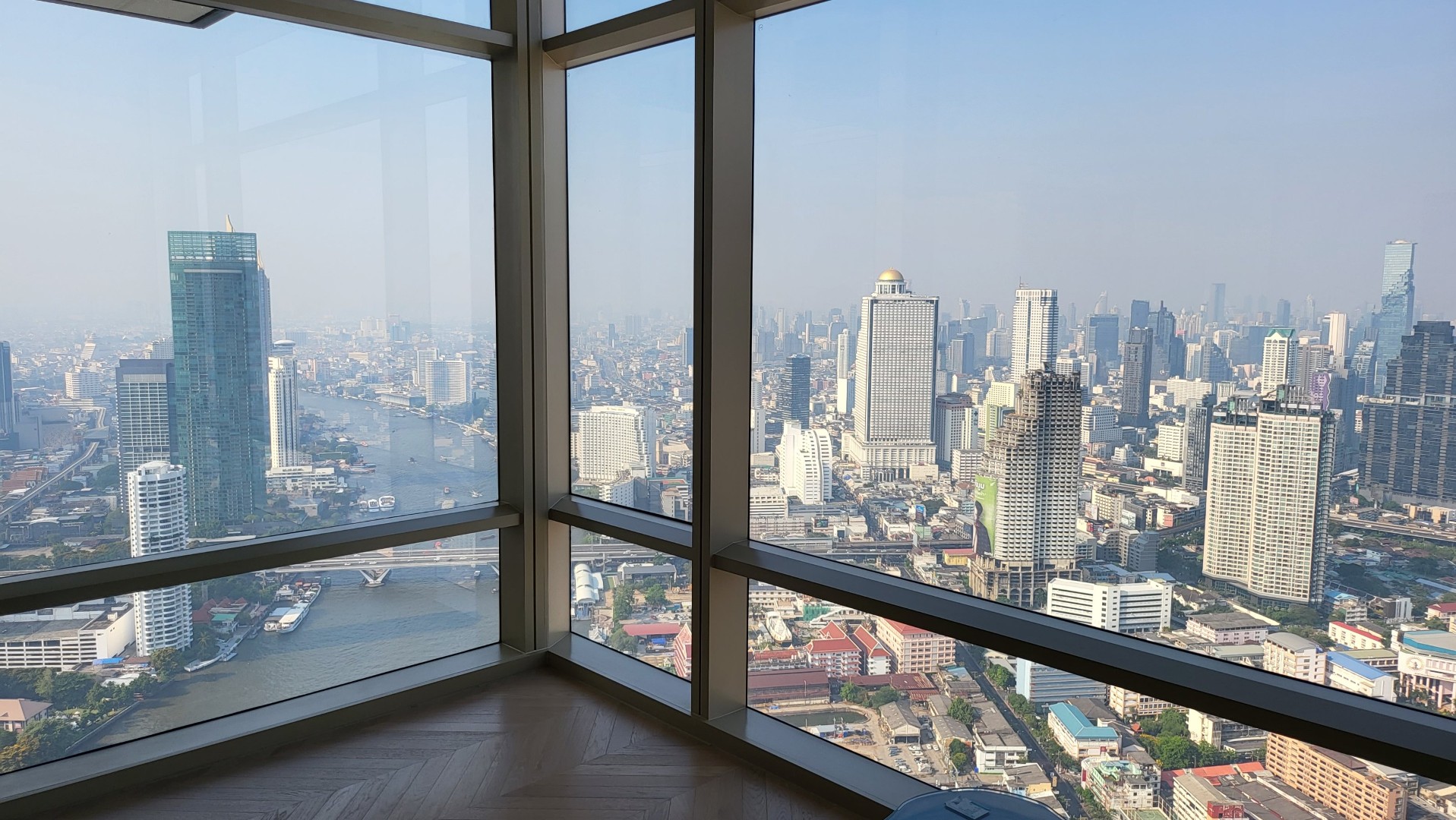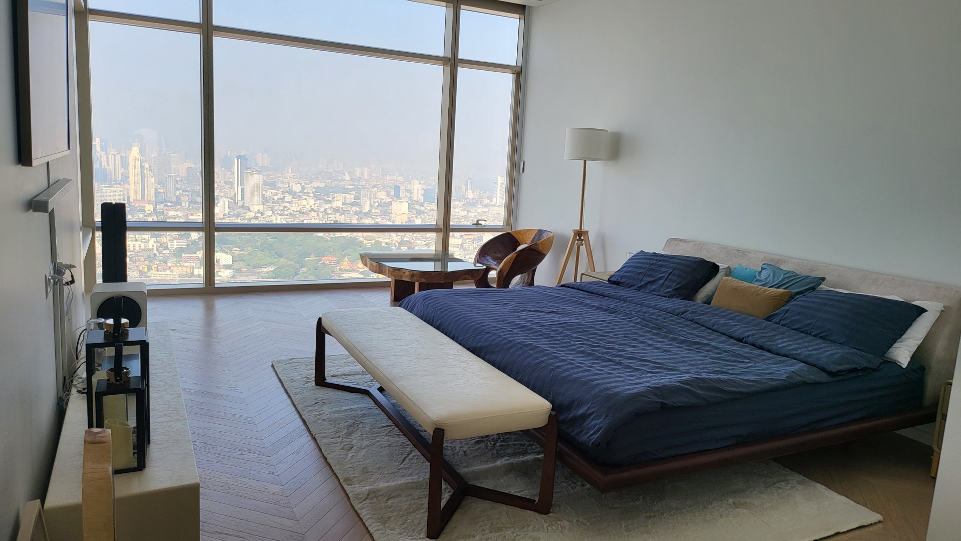 Positioned on the 50th and 51st  floors, the unit is in a duplex configuration and covers an area of 240 square metres with breath taking views of the river and the Bangkok skyline in all directions. The unit is configured with 3-bedrooms, and additional bedroom or study area, large living and dining areas, a separate kitchen and staff quarters and an outside terrace.
